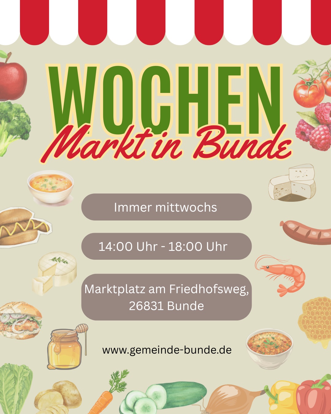 Ab dem 25. Juni 2025 findet jeden Mittwoch von 14:00 bis 18:00 Uhr ein Wochenmarkt auf dem Marktplatz am Friedhofsweg in Bunde statt.