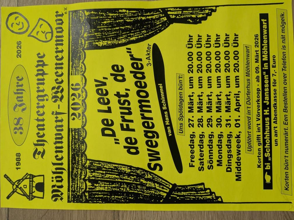 Die Theatergruppe Möhlenwarf / Weenermoor e.V. führt in diesem Jahr das plattdeutsche Theaterstück „De Leev, de Frust, de Swegermoeder“ auf.