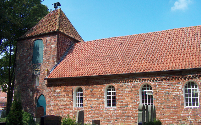 Versteckt hinter den Häusern des lang gestreckten Dorfes liegt auf einer Warf die im 14. Jh. erbaute Kirche.