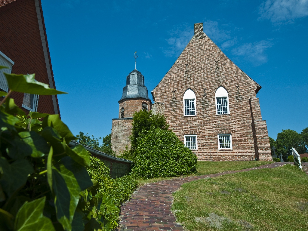 - Ev.-luth. Kirche. Gleich neben dem Schlickmuseum befindet sich auf einer Kirchwarf die evangelisch-lutherische Kirche mit der markanten Turmspitze (Teebüs).